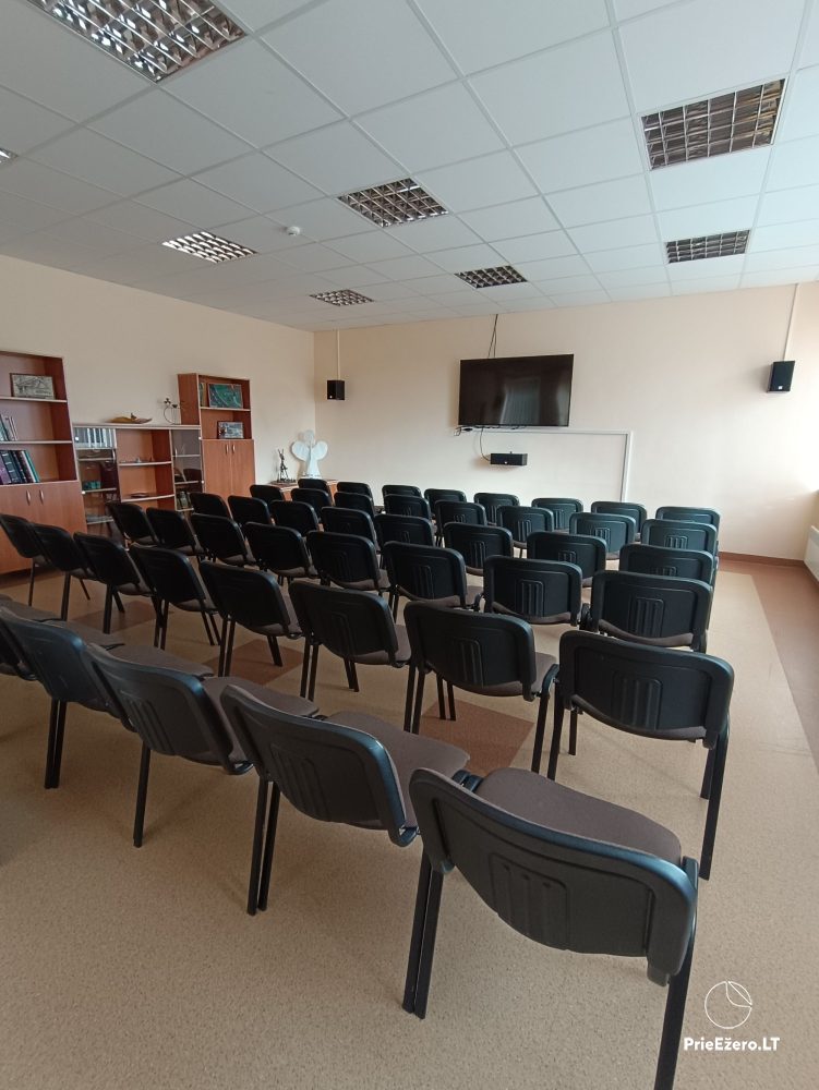 • Konferencijų salė: Talpina iki 30 žmonių darbui grupėmis prie stalų. Čia rasite atnaujintus baldus, kurie siekia aukščiausią ergonomiškumo ir praktiškumo lygį. Be to, galima papildomai išsinuomoti išmanųjį televizorių, kuris padedantis pristatyti jūsų pranešimus įspūdingai ir efektyviai. Esant poreikiui galima išsiplėsti ir patalpoje paskaitai ar seminarui klausyti sutalpinti iki 60 žmonių.