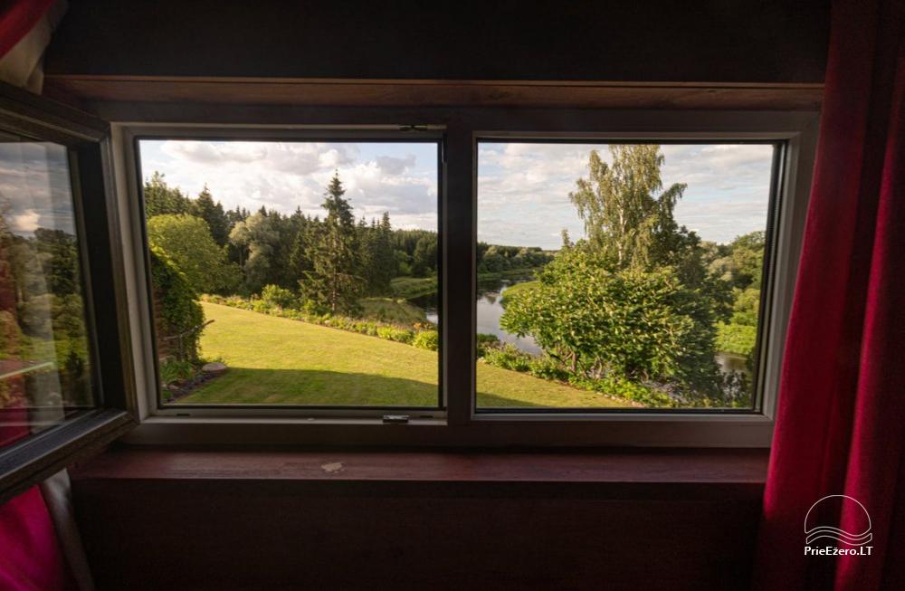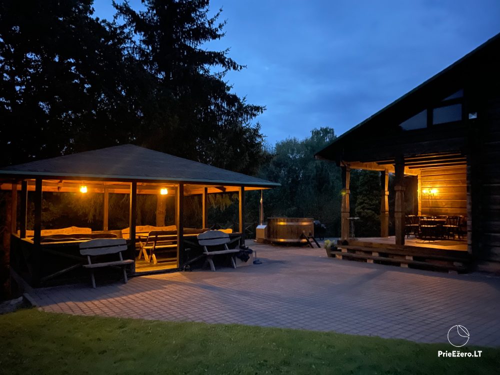 • Sodybos name – nakvynė 20 iki žmonių. Name yra svetainė, virtuvėlė, pirtis, 3 WC ir 2 dušai.