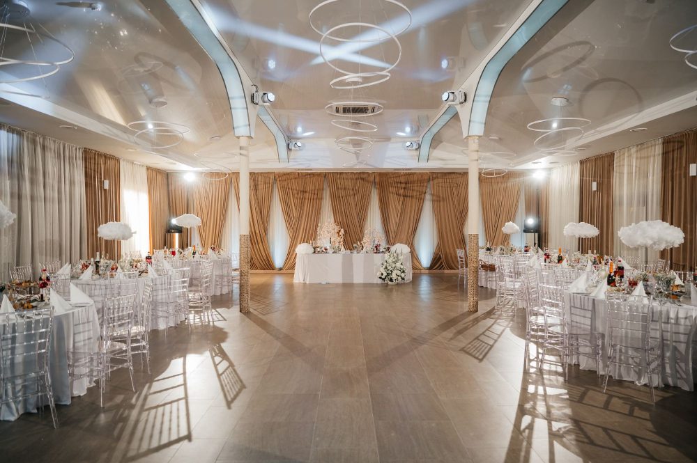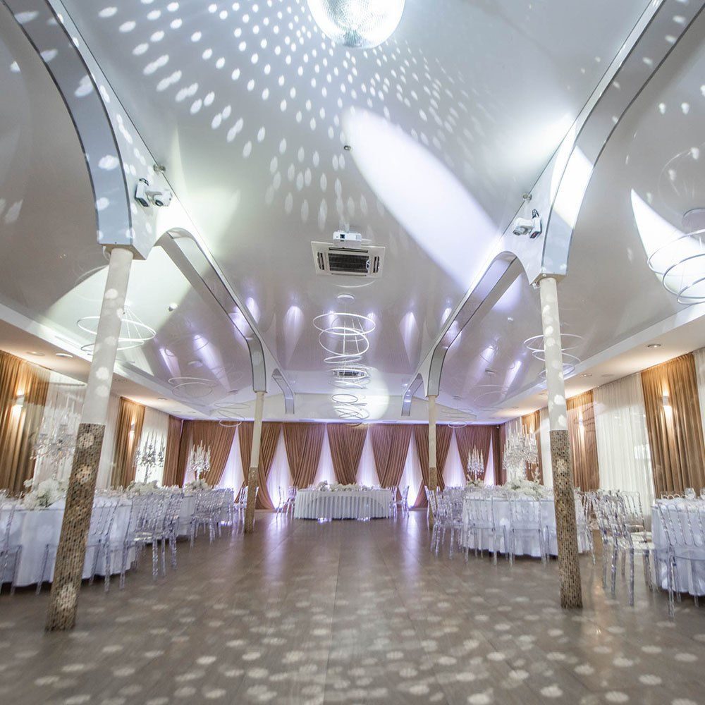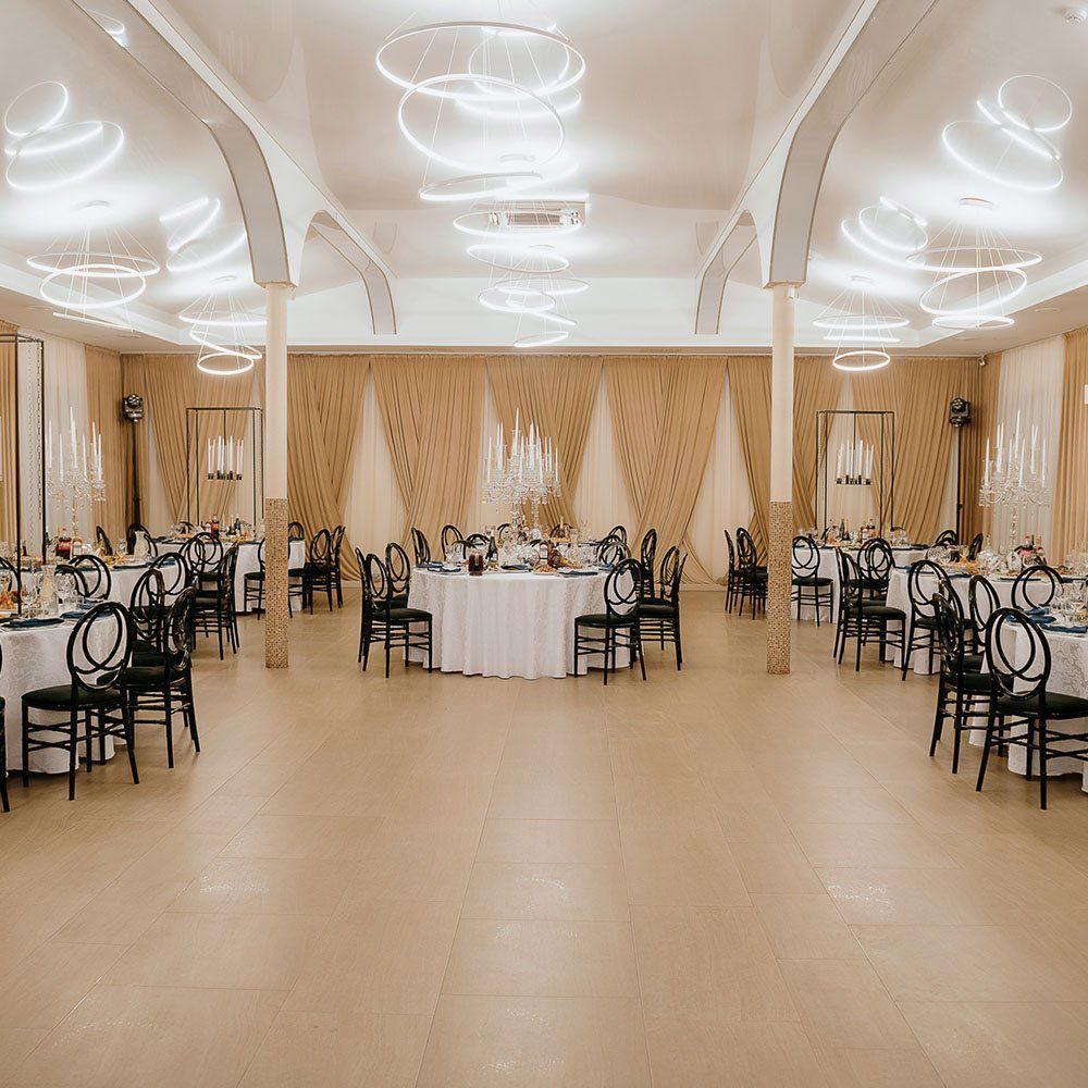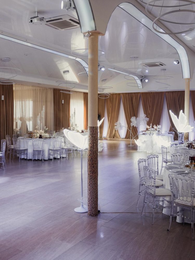Pobūvių salė erdvi, su aukštomis lubomis, todėl sukuria lengvumo ir erdvės pojūtį. Ji universali ir lengvai pritaikoma prie bet kokio dekoro bei šventės stilistikos.