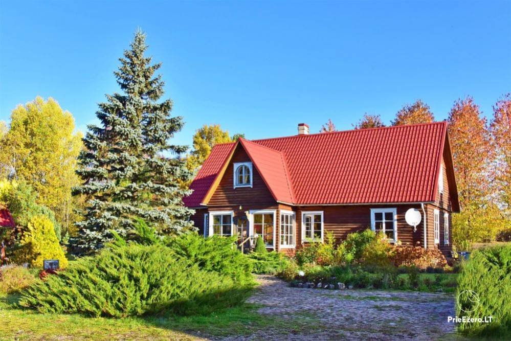 Pagrindiniame name gali apsistoti iki 15 svečių; jame yra virtuvė su visa reikiama įranga, erdvi svetainė su židiniu, talpinanti 30 svečių, dušas, WC.