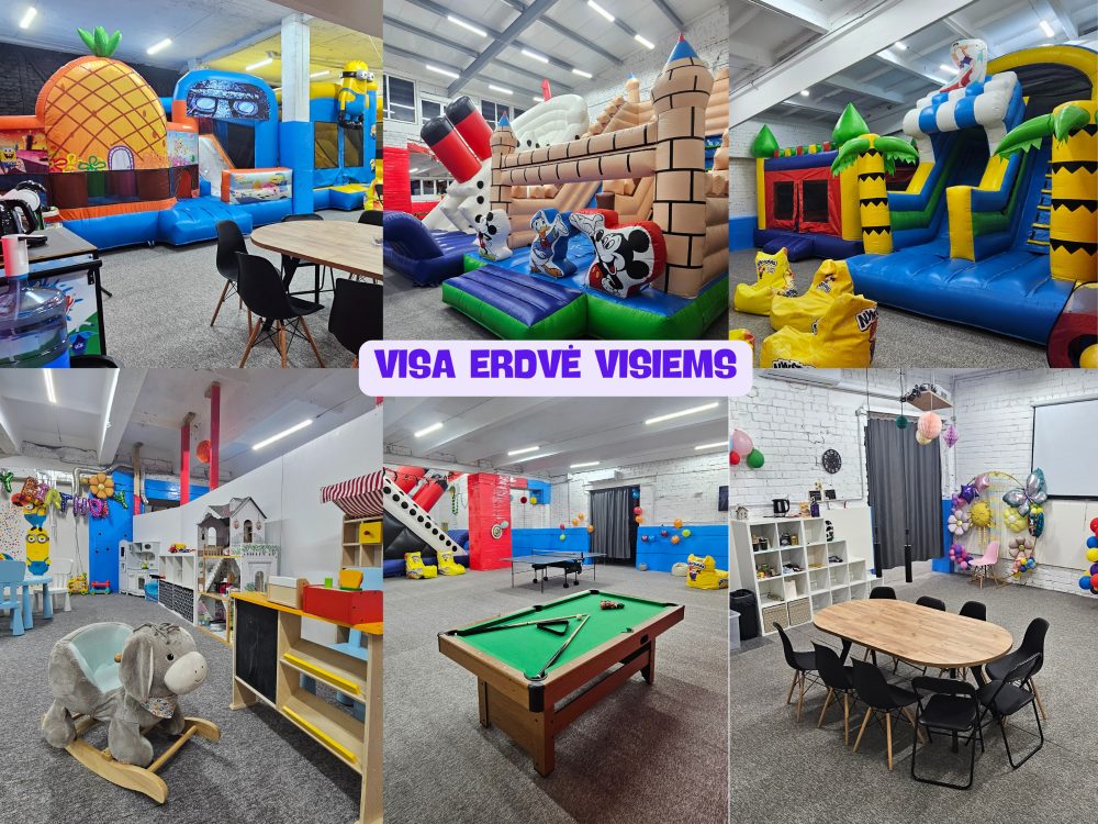 Stalo tenisas, Oro ritulys, Krepšinis, Stalo futbolas, Biliardas, Lipnūs dartai, 2 dideli 6 metrų aukščio batutai, poilsio kambarys su projektoriumi.