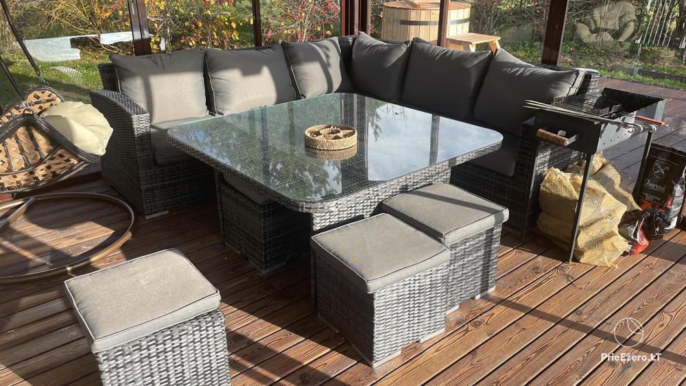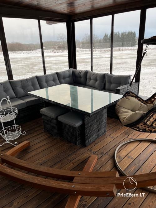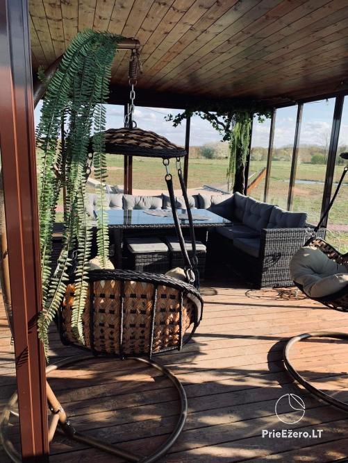 Sodyboje galima pasikaitinti pirtyje, pasimėgauti šilto kubilo malonumais ar tiesiog svajingai sėdėti supamoje kėdėje ir žiūrėti į natūralų kraštovaizdį didelėje šildomoje terasoje šaltais vakarais.