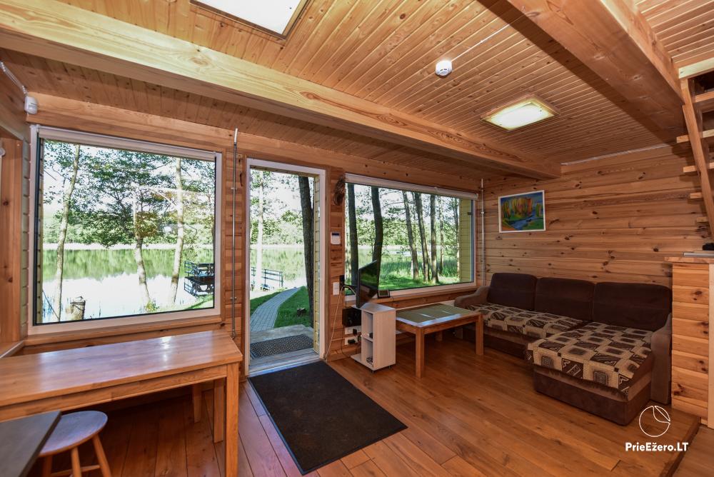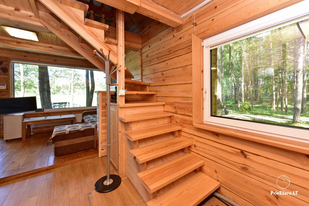 Namelis pritaikytas gyventi jame visus metus, puikiai tinkamas apsistoti ilgesniam laikotarpiui. Viduje rasite du miegamuosius kambarius su dvigulėmis lovomis, bendrą erdvę su pilnai įrengta virtuve, saunos zoną su tualete, dušu ir sauna. Bendroje erdvėje yra sofa su miegamąja funkcija, tad namelyje gali apsistoti iki 6 asmenų.