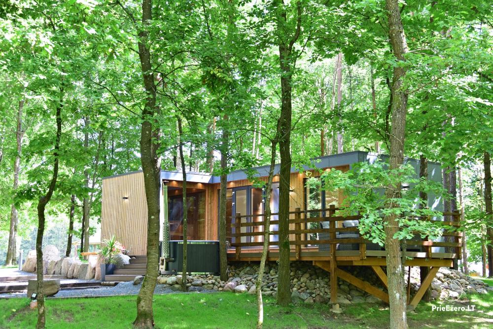 Išskirtinis namelis miško apsuptyje tik dviem arba 3-4 asmenų šeimai. Pro vitrininius langus (taip pat ir pirtyje) bei didelėje terasoje atsiveria puikus miško vaizdas.