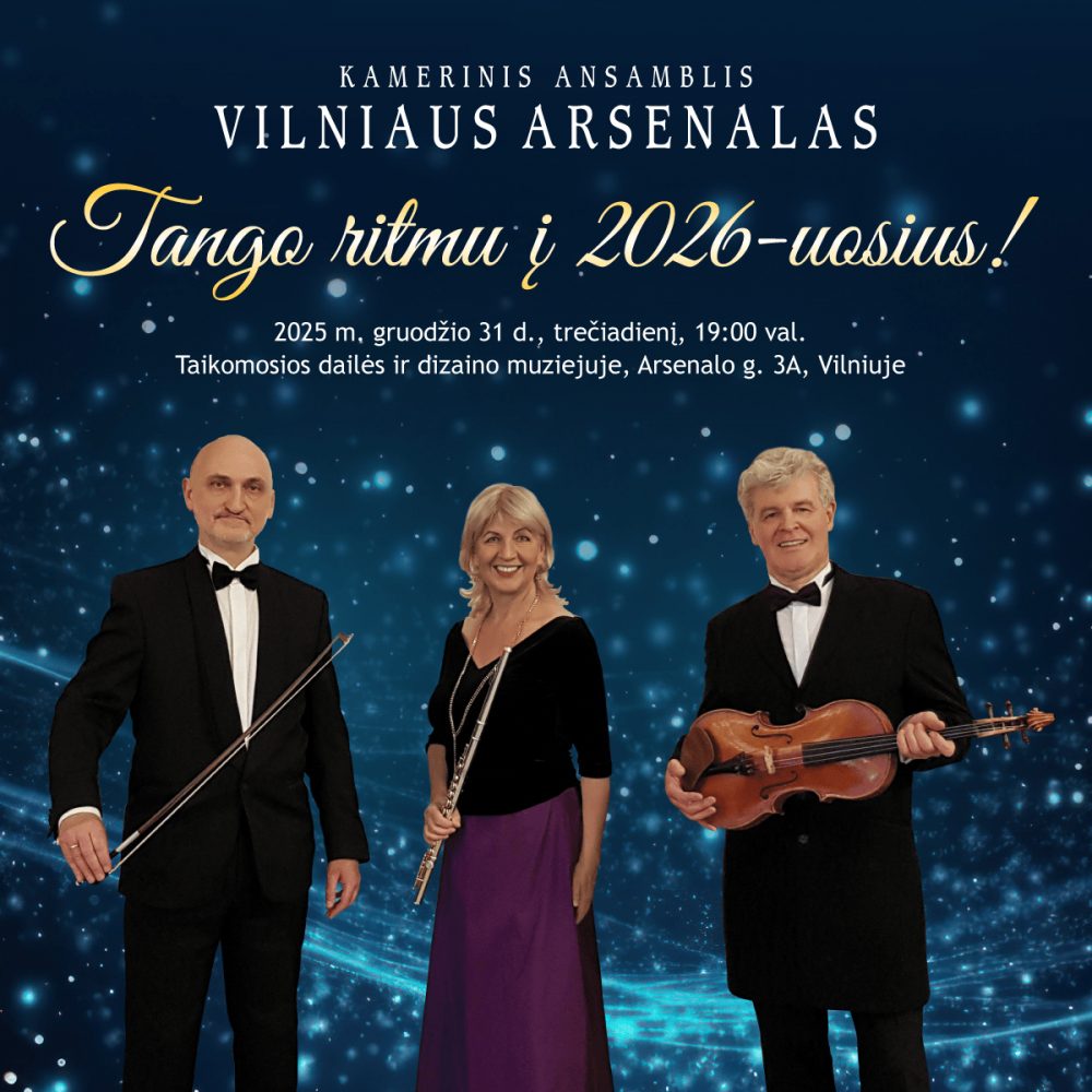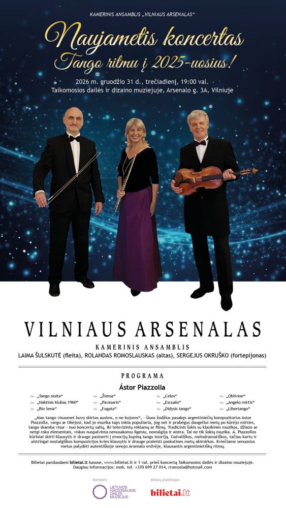 „Man tango visuomet buvo skirtas ausims, o ne kojoms“, – šiuos žodžius pasakęs argentiniečių kompozitorius Astor Piazzolla, vargu ar tikėjosi, kad jo muzika taps tokia populiaria, jog net ir prabėgus daugeliui metų po kūrėjo mirties, tango skamba visur – nuo koncertų salių, iki televizinių reklamų ar filmų. Tradicinis šokis su klasikinės muzikos, džiazo ar netgi roko elementais, viskas nuspalvinta nenusakomu ilgesiu, nostalgija ir aistra. Tai ne tik šokių muzika. Á. Piazzollos kūriniai skirti klausytis ir drauge pasinerti į emocijų kupiną tango istoriją. Gaivališkos, melodramatiškos, tačiau kartu ir aistringai nostalgiškos kompozicijos kvies klausytis ir drauge praleisti paskutines metų akimirkas. Kviečiame senuosius metus palydėti autentiškoje senojo Arsenalo erdvėje, klausantis argentinietiškų ritmų.