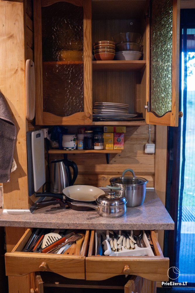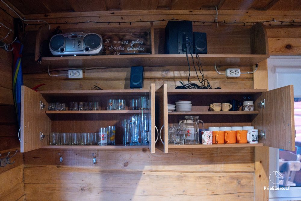 laužavietė, šašlykinė (grotelės, iešmai), krosnelė kazanui (12 litrų kazanas ir ketaus keptuvė);