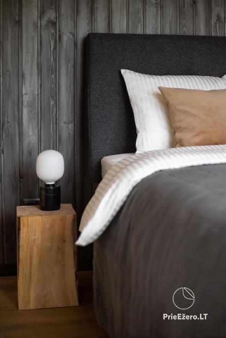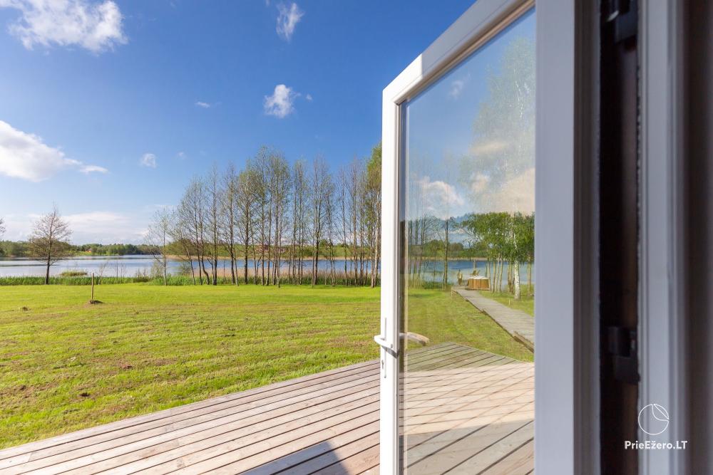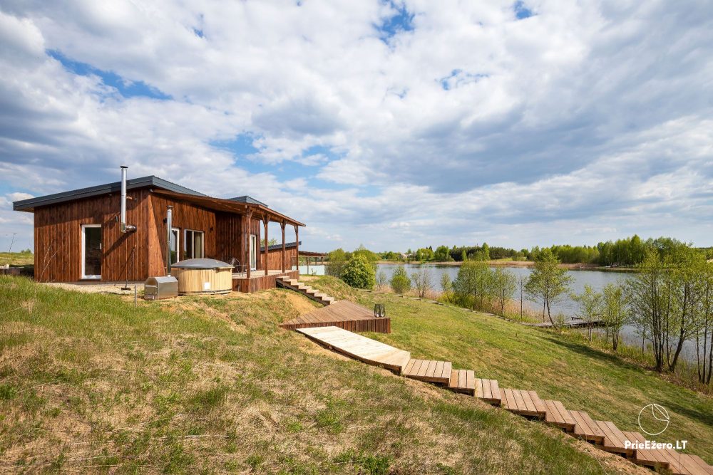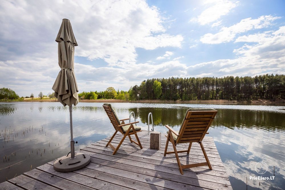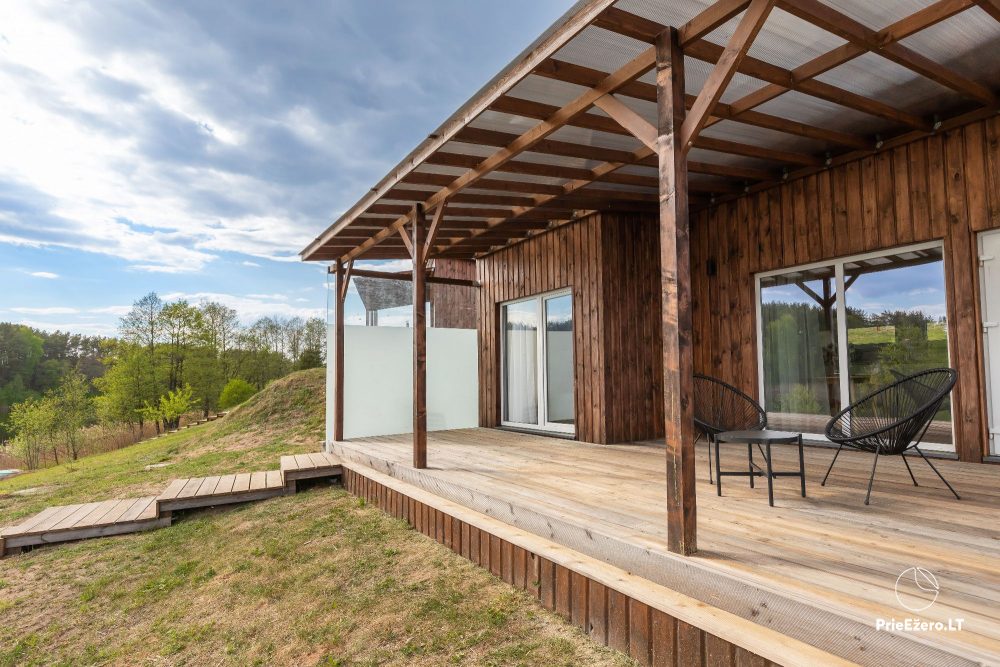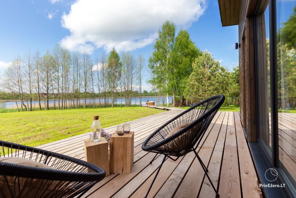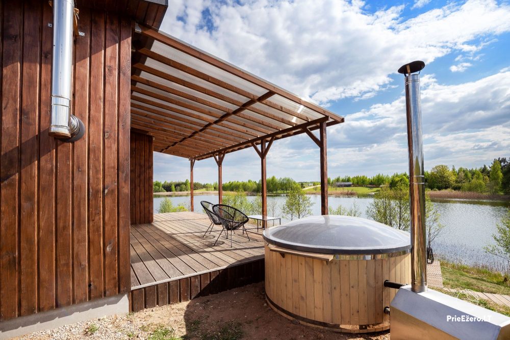 - Namelį iš dviejų pusių supa erdvi terasa, kurioje ramiai lydėsite saulę ar mediniu takeliu leisitės į atpalaiduojantį kubilą ant ežero kranto.