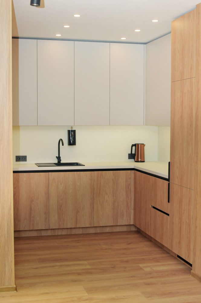 - Virtuvėlė su indais, šaldytuvu, virduliu