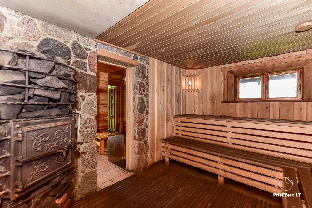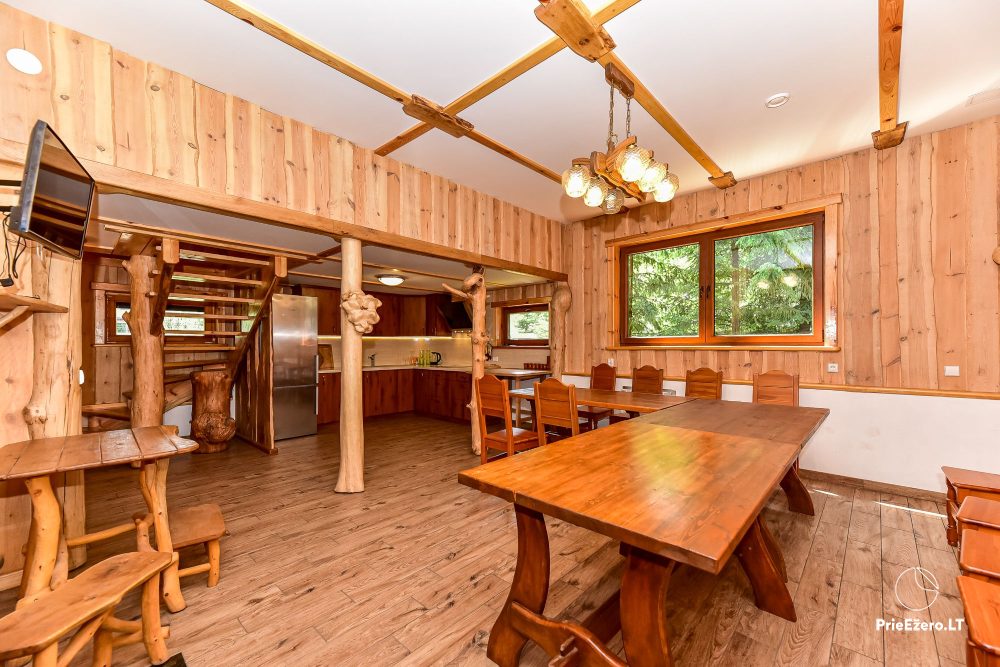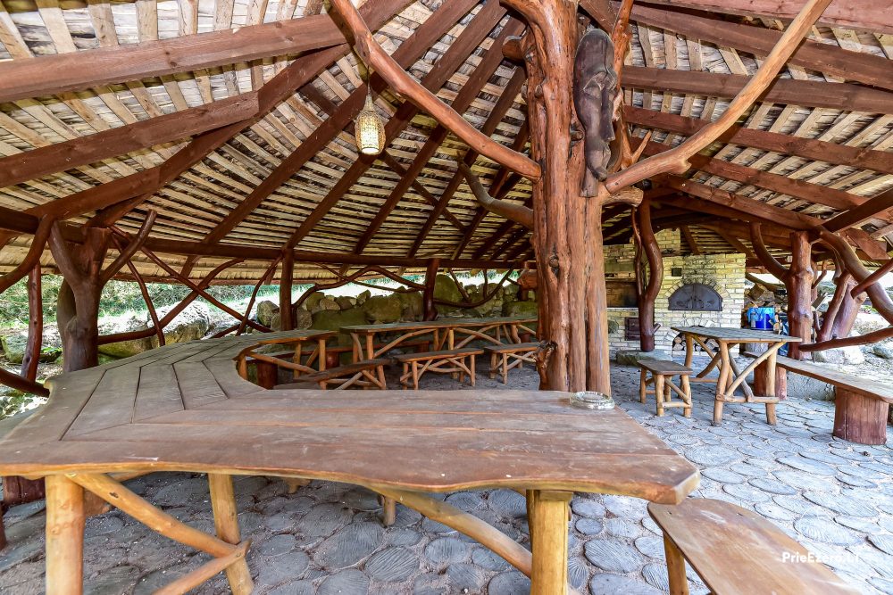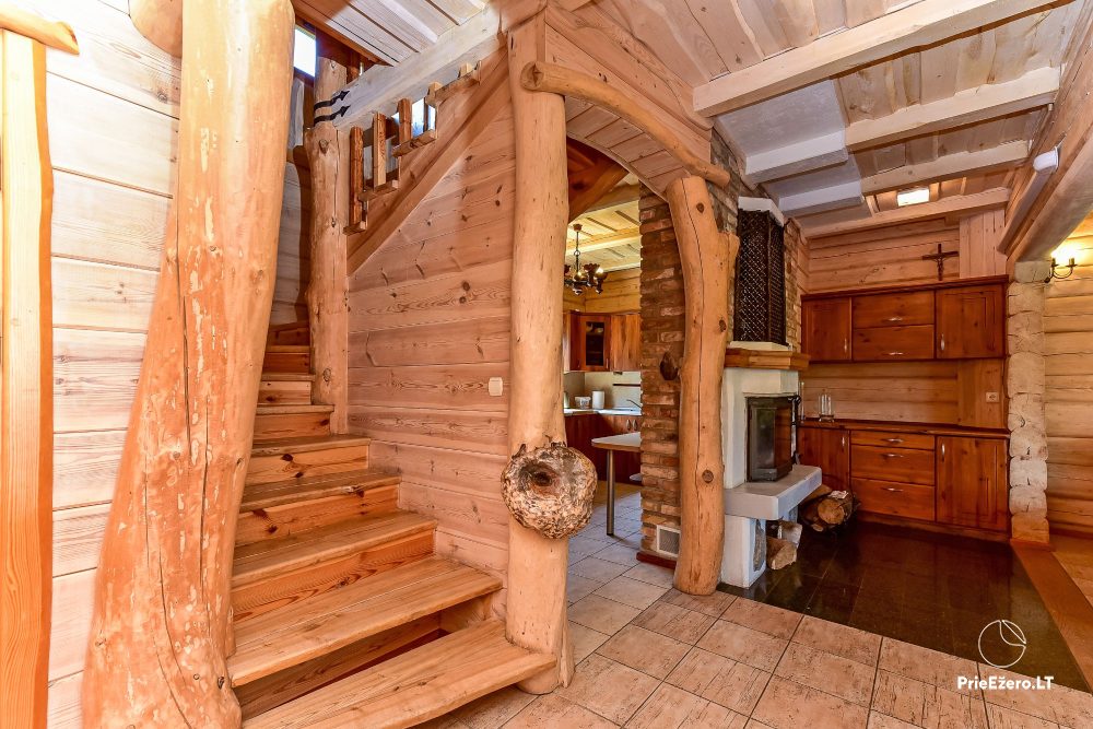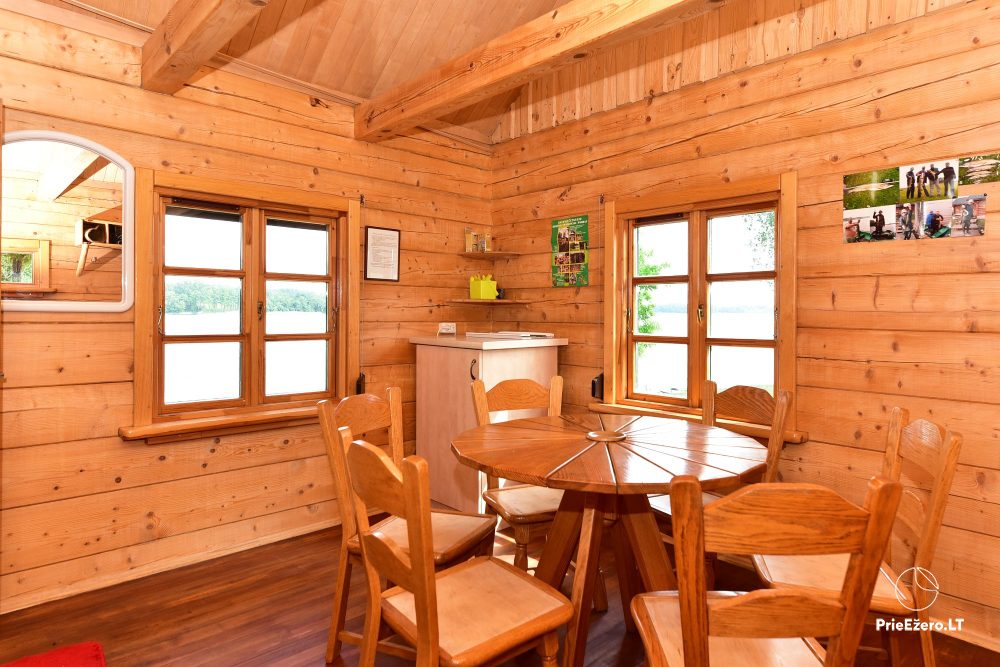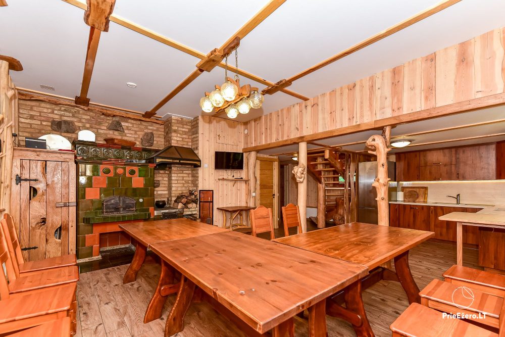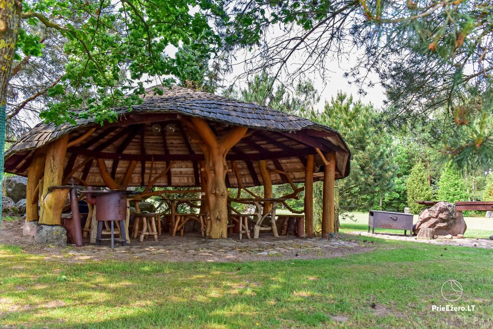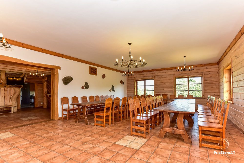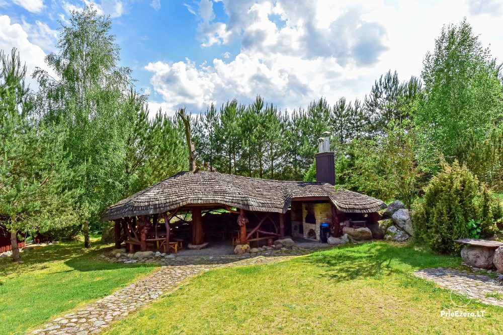 Plačioje sodybos ežero pakrantėje įrengti keturi rąstiniai namai su visais patogumais, pradedant pokylio salėmis, miegamaisiais ir baigiant pirtimis bei lauko židiniais.
