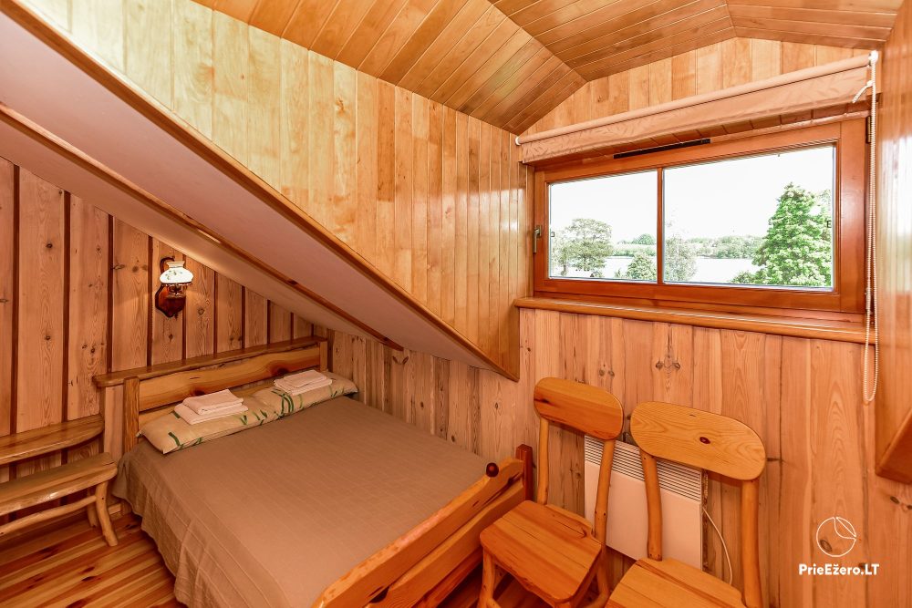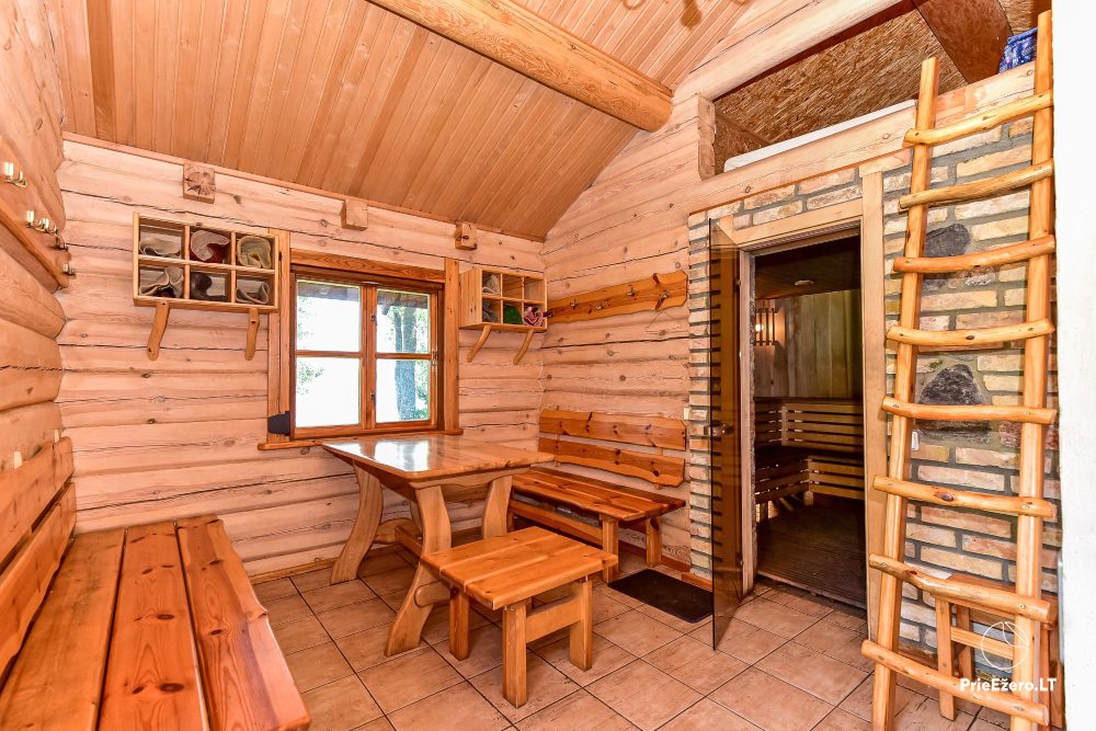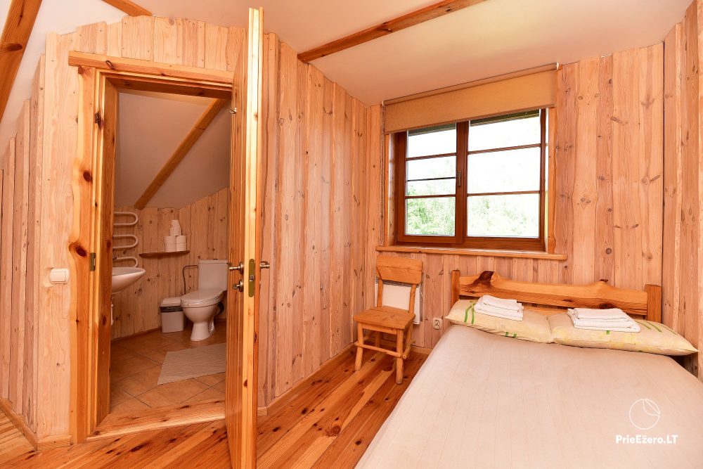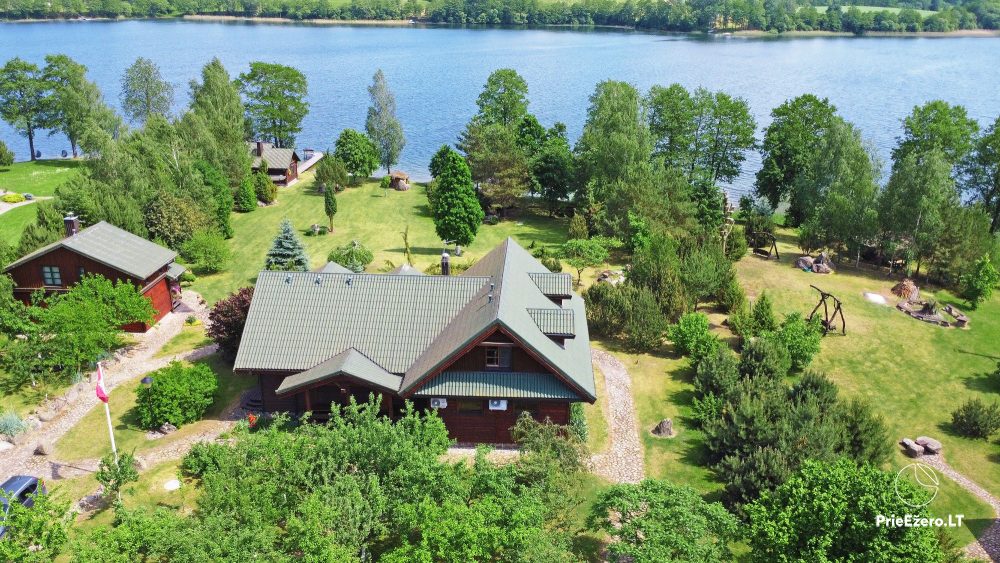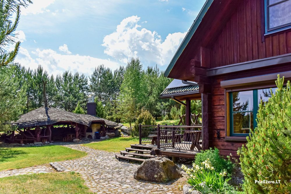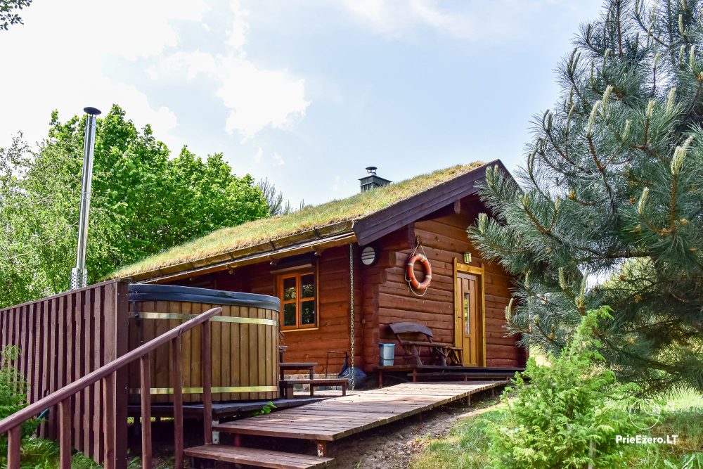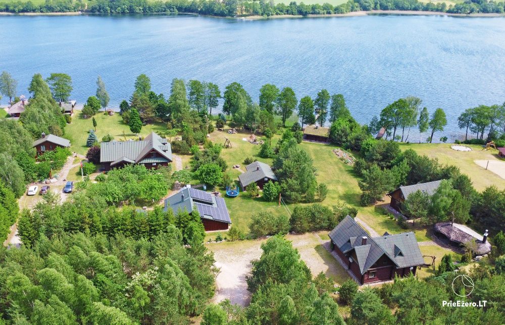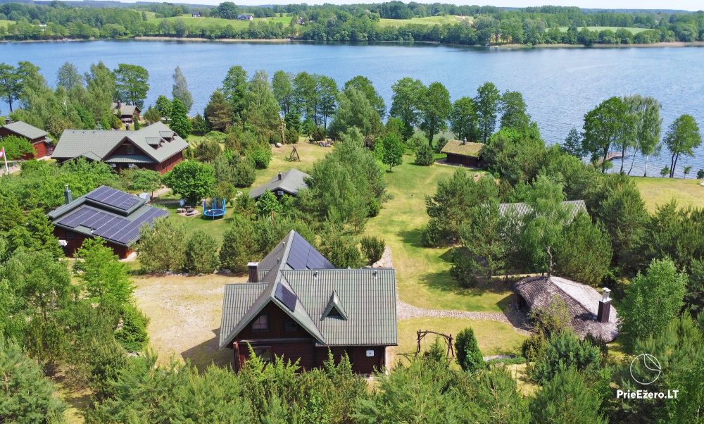 Plačioje sodybos ežero pakrantėje įrengti rąstiniai namai siūlo visus patogumus, reikalingus komfortabiliam poilsiui.