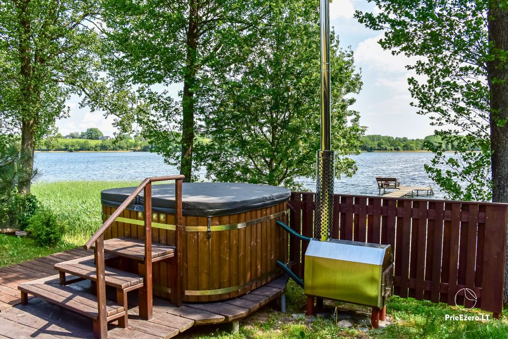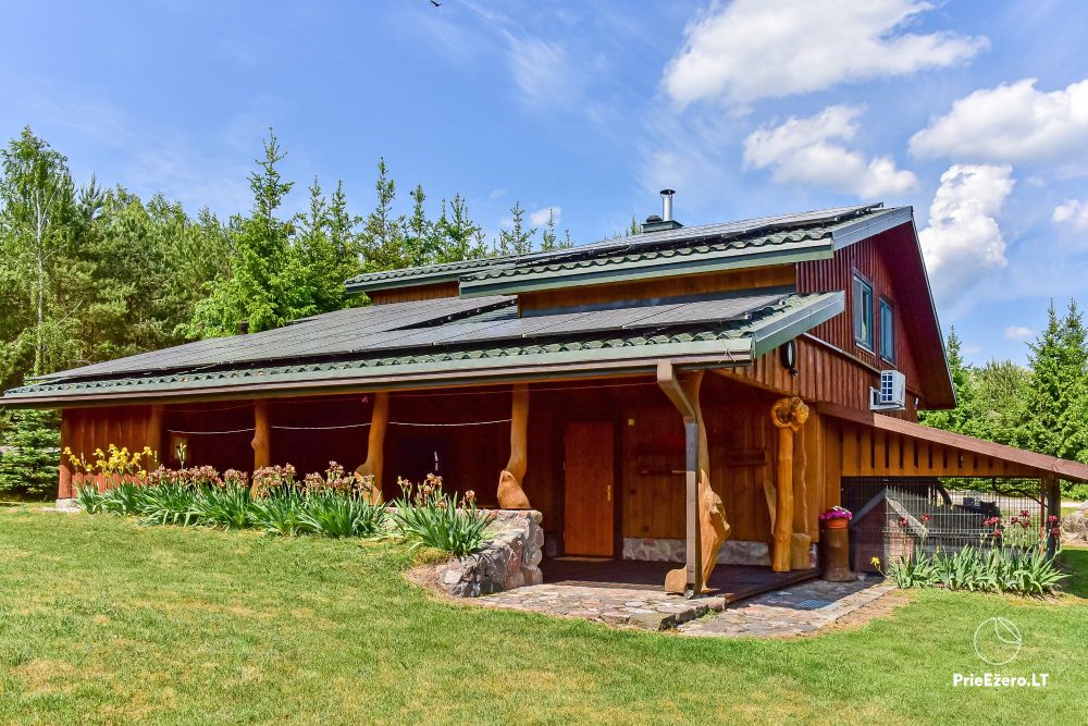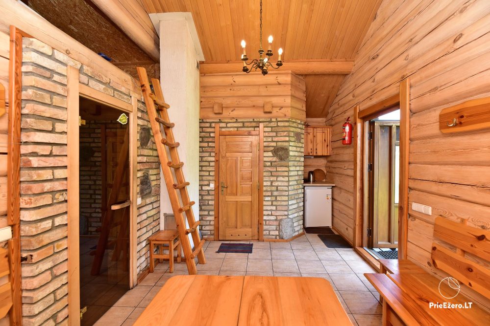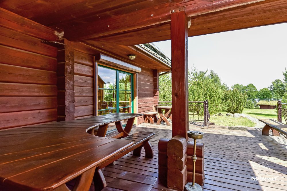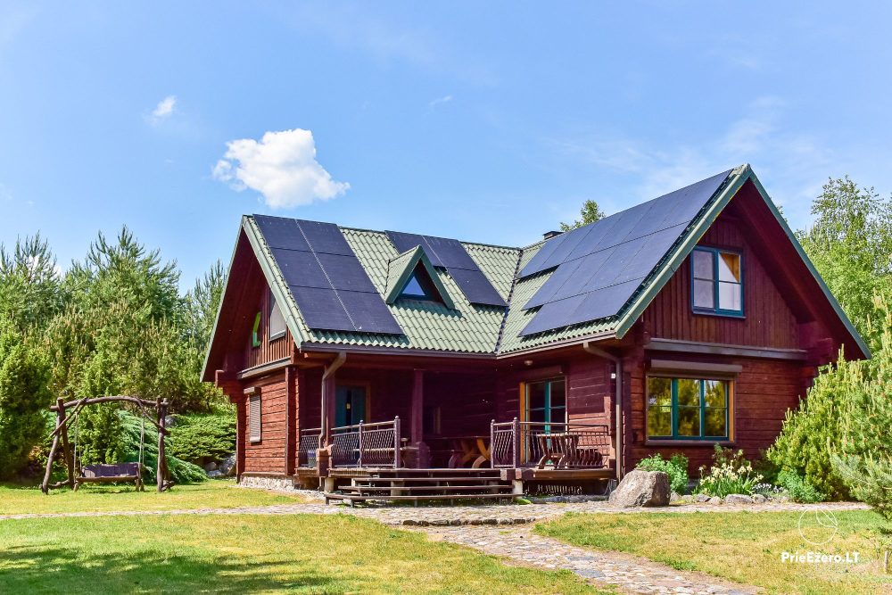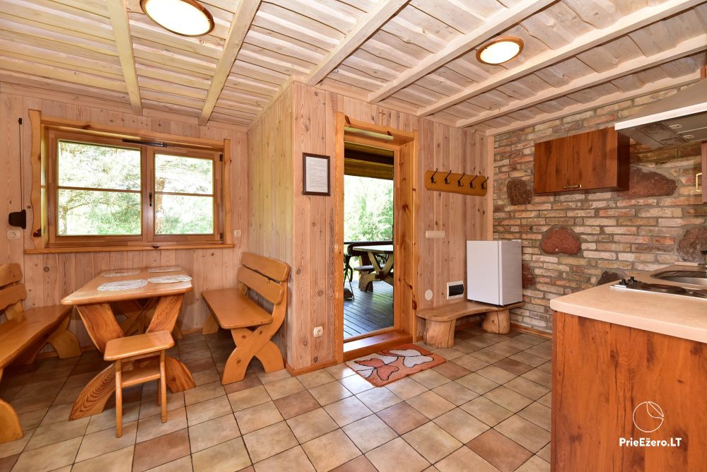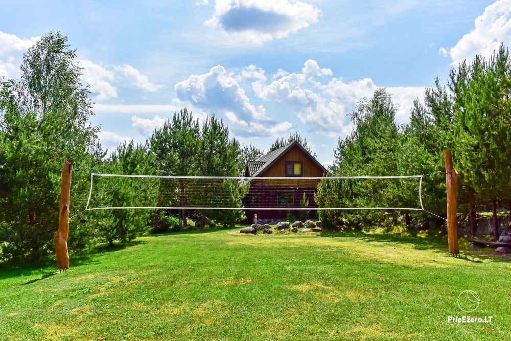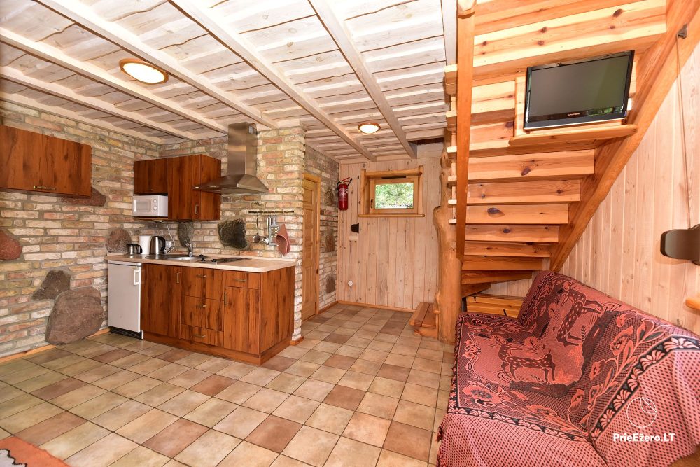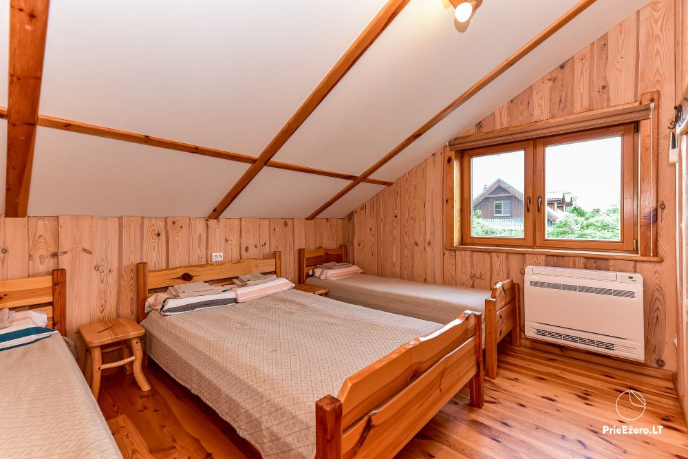 Plačioje sodybos ežero pakrantėje įrengti rąstiniai namai siūlo visus patogumus, reikalingus komfortabiliam poilsiui.