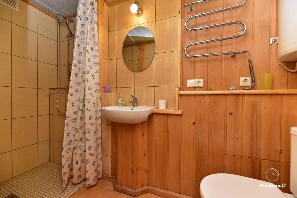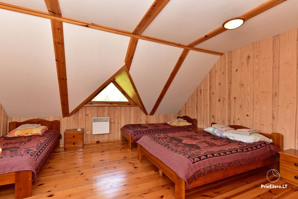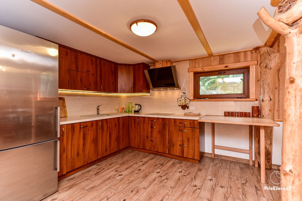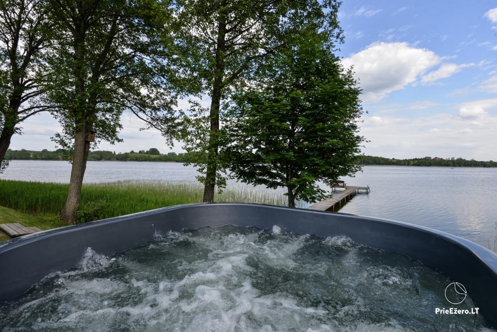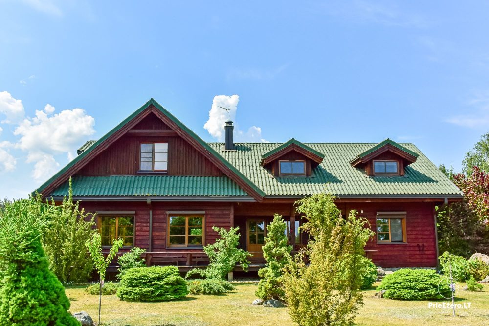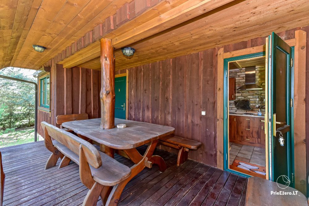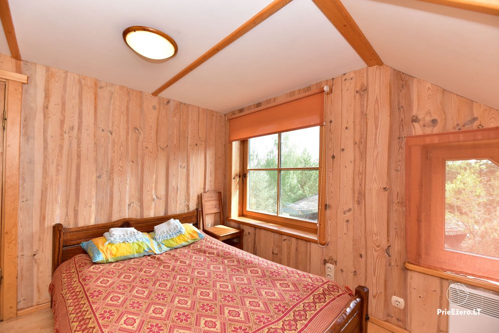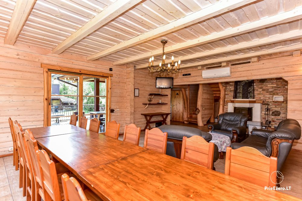 Plačioje sodybos ežero pakrantėje įrengti rąstiniai namai siūlo visus patogumus, reikalingus komfortabiliam poilsiui.