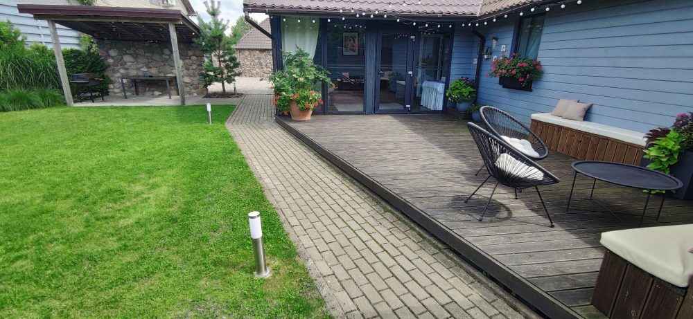 Lauke - erdvi terasa, šašlykinė, iešmai, žolynas.