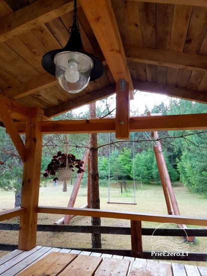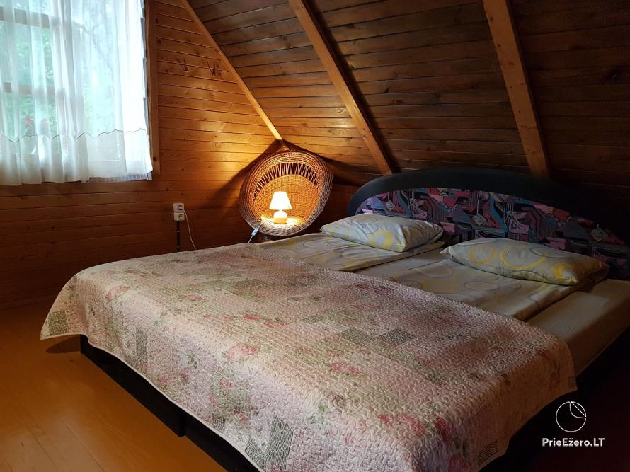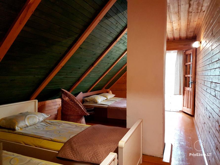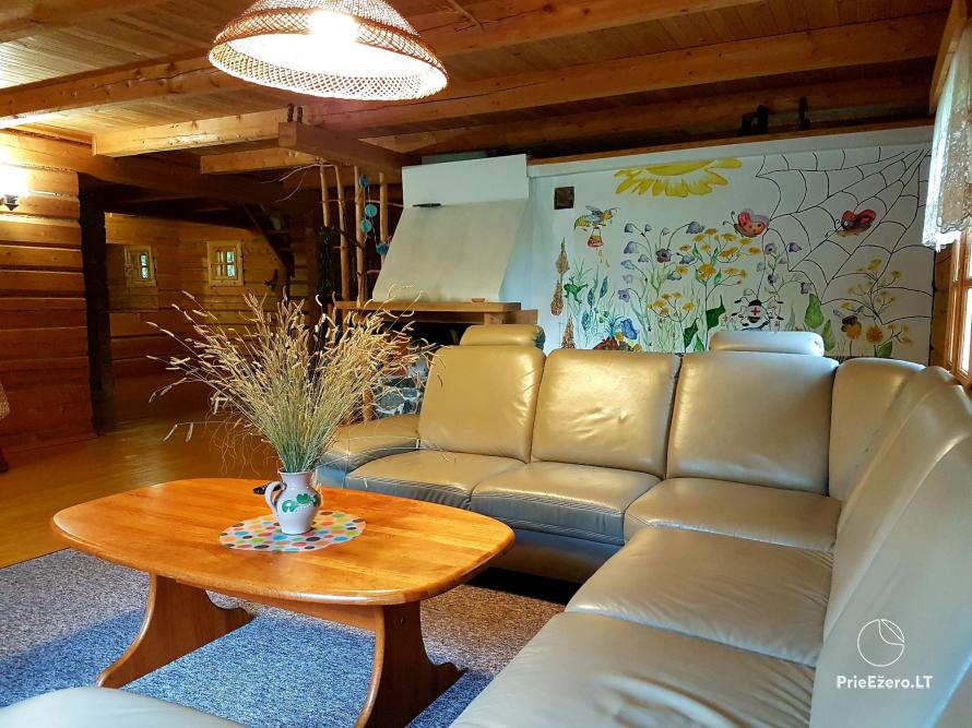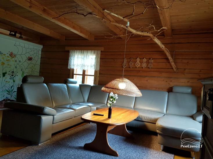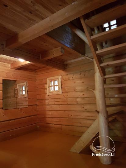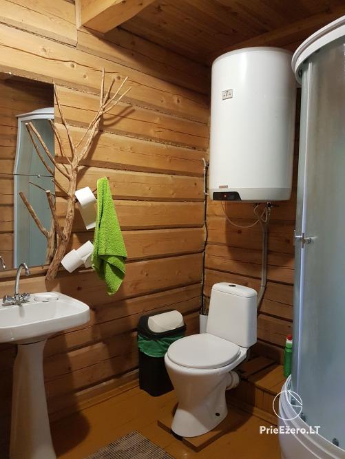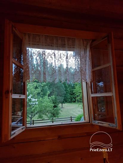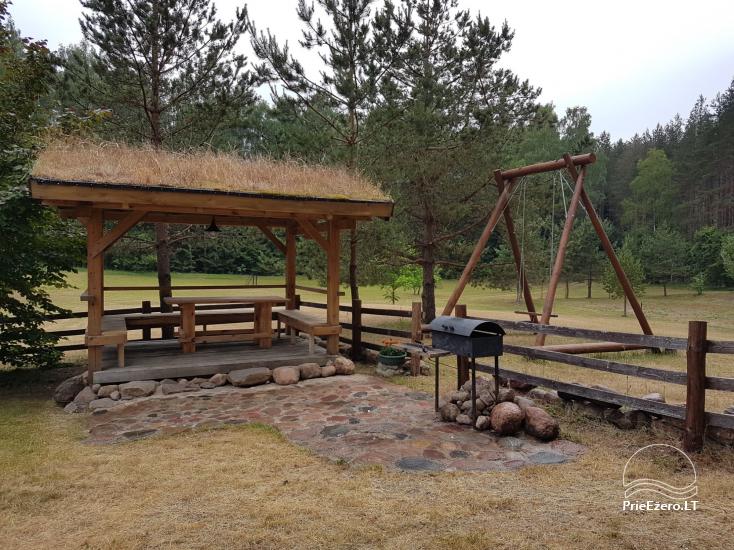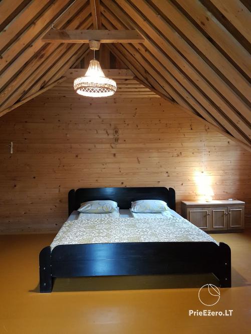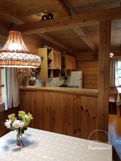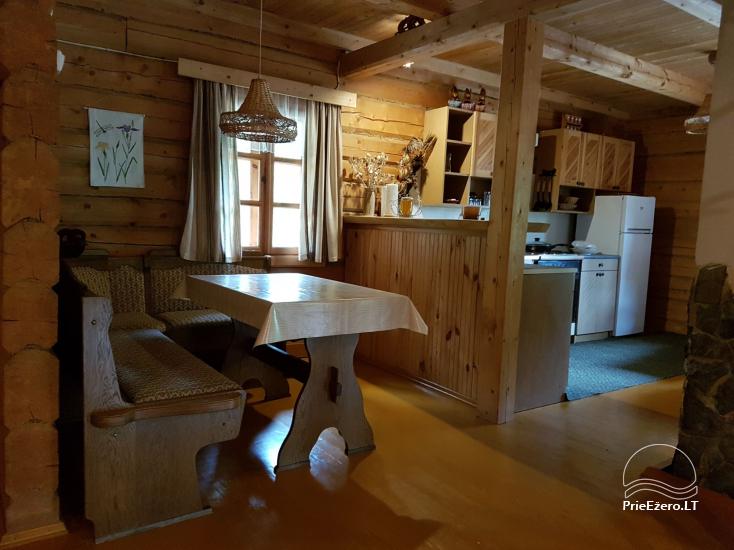 - Rąstinis namelis su miegamaisiais kambariais (10 miegamų vietų), pilnai įrengta virtuvė, erdvi svetainė su židiniu ir vaizdo aparatūra, dušas ir tualetas.
