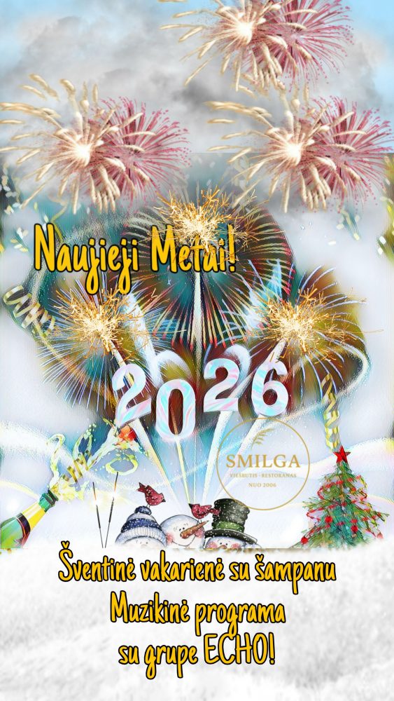 Gruodžio 31 d. – iškilmingas Naujųjų metų sutikimas! Gyva muzika – grupė ECHO Šventinė vakarienė su šampanu Klasikinis restorano „Smilga“ meniu